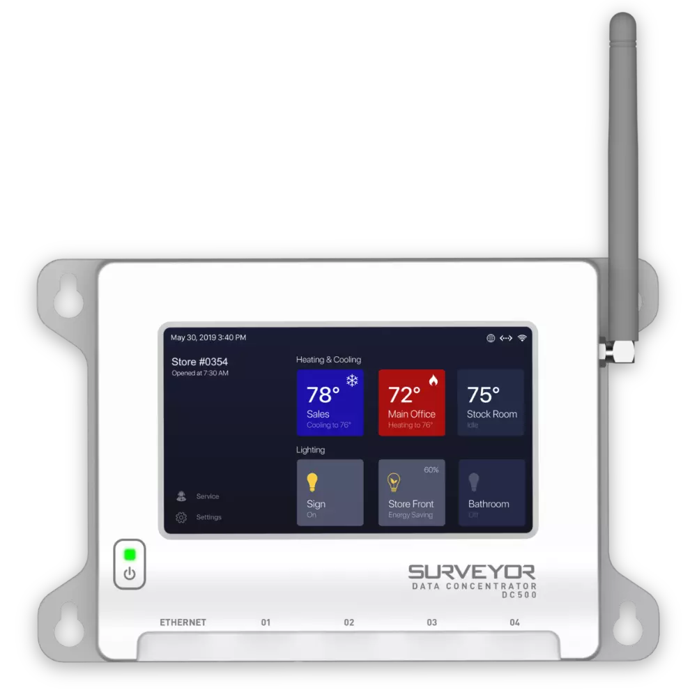 Control equipment at thousands of locations across a corporate network, while monitoring environmental conditions and system performance. The new DC500 works with existing systems and connects to Surveyor Cloud with a wired or wireless connection.
