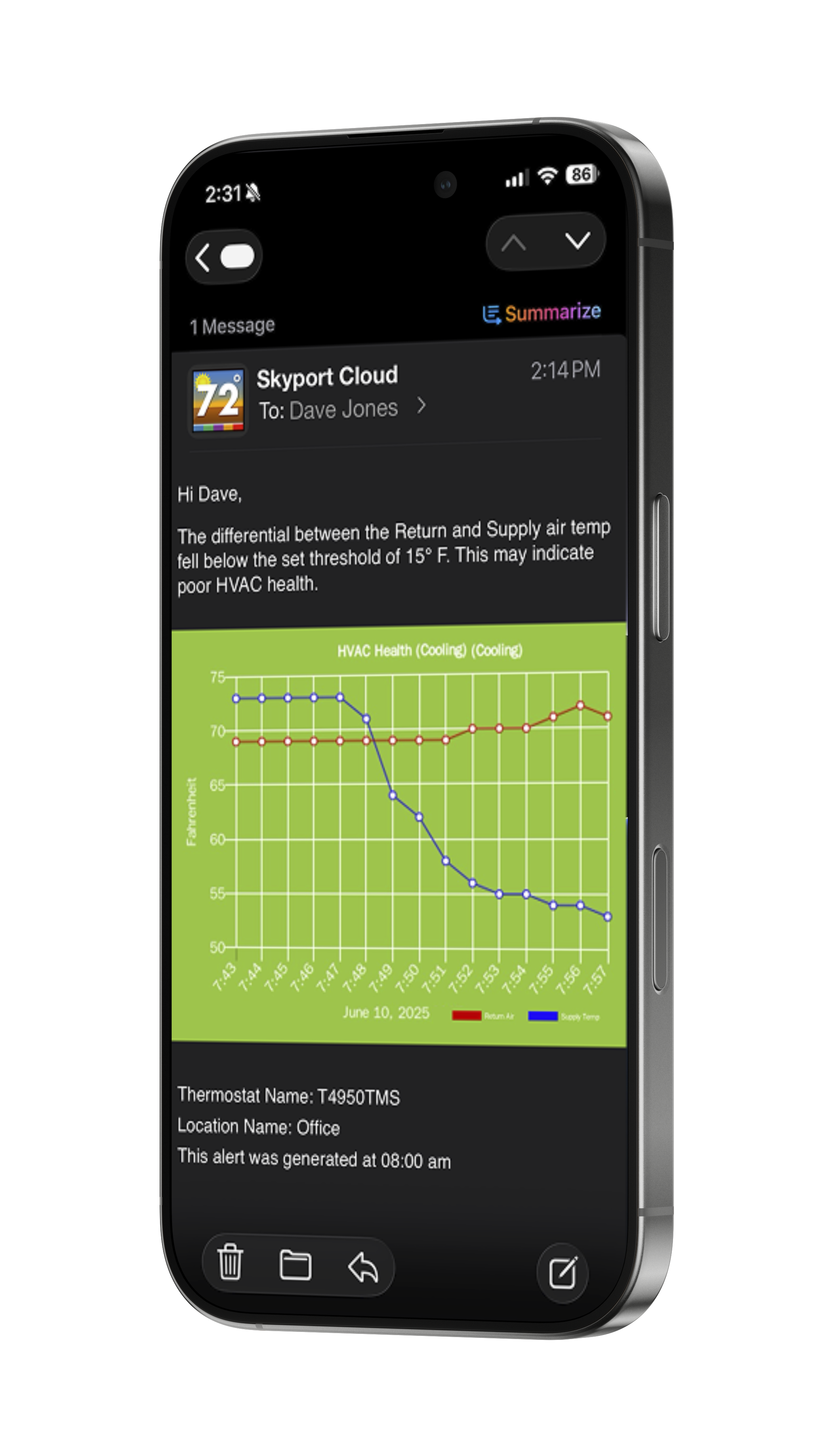 Connected through Skyport Cloud, the T4950-TMS continuously analyzes HVAC performance. If the system fails to reach your desired supply/return temperature difference within the parameters you set, an HVAC Health Alert is sent instantly to your phone, tablet, or dashboard.