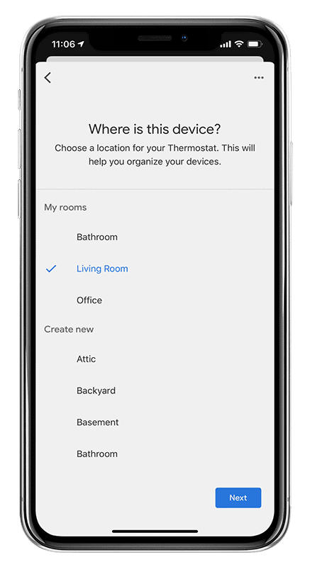 Select the room your thermostat is in. Press next. Your thermostat is now connected to